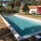 La piscine est équipée de pièces à sceller en ABS et d’un réseau de canalisations en PVC rigide, assurant une circulation optimale de l’eau et une installation durable.